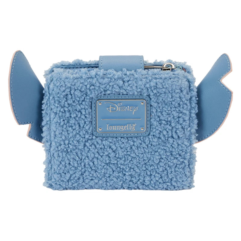 The Loungefly Disney Stitch Plush Bifold Wallet is made of vegan leather (polyurethane) with sherpa material. Wallet snaps closed with silver-colored metal hardware. Additional features include applique, embroidered, and printed details. Take note of the coordinating inside lining.